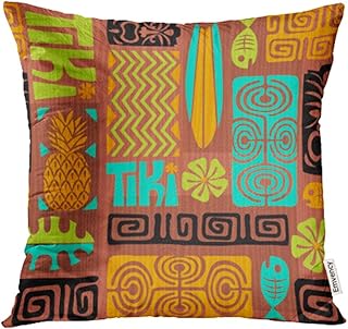 Emvency 装飾用クッションカバー カラフルなプルメリアエキゾチックティキパターン 抽象的 エスニック 魚 花 ハワイアン 20x20インチ ケース 正方形 枕カバー 両面プリント