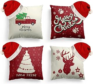 クリスマス枕カバー 4枚セット 18 x 18インチ 装飾用クッションカバー ソファピローケース クリスマスデコレーション ホームデコレーション (クリスマスセット ホワイト 12、リネン)