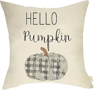 Fjfz 秋 ファームハウス 装飾用クッションカバー ハローサイン ブラック ホワイト バッファロー格子柄 パンプキン 秋 感謝祭 ホリデー デコレーション コットンリネン クッションケース ソファ カウチ用 18インチ x 18インチ