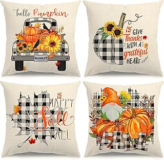 KISVODS 秋用枕カバー 18×18インチ 4枚セット バッファローチェック パンプキン 装飾用クッションカバー 秋の装飾 装飾用クッションカバー ホリデー 素朴なリネン 秋の枕カバー ソファ カウチ用