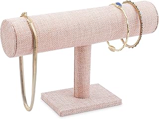 Ikee Design ピンクリネン木製ジュエリーブレスレットディスプレイホルダー ファブリックカバーTバーブレスレットネックレスジュエリーディスプレイスタンド ホーム整理用 幅8 3/4インチ x 奥行き2 3/4インチ x 高さ5 1/4インチ