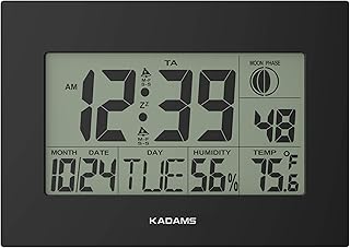 KADAMS 壁掛け時計 大型時計 カレンダー 月日 室内温度湿度 月相 アラーム スヌーズ機能 折りたたみテーブルスタンド 電池式 (ブラック)